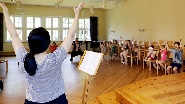 Im Heinrich-Schütz-Saal sitzen die Kinder in großer Runde und üben mit Fiona-Luisa Huang das Musical ein. Die passenden Gesten zum Text werden gleich mitgelernt. Und wie der Mund zu öffnen ist, damit der Ton auch klar herauskommt, das ist von den Mädchen und Jungen leicht nachzumachen. „Ich finde es sehr schön, wie die Chorleiterin das Lied mittels Bewegung rübergebracht hat. Hier lernt man spielend beim Singen“, sagt Henriette Kraatz. Die Berlinerin ist mit ihrer Mutter Sunnhild erstmals bei der Singwoche dabei. „Es ist eine bunte Mischung aus Musik, und das Vermitteln ist auch anders, eine schöne Bereicherung“, sagt Henriette Kraatz, die an Stelle einer Freundin nun die Gelegenheit nutzt, eine Ferienwoche singend zu verbringen. Für Selina Buhr mit ihren Kindern Liana (2), Mateo (6) und Mira (8), ihre Schwester Isabella Jahns und Nichte Maria Friedo gehört die Familiensingwoche schon seit der Kindheit zum festen Bestandteil des Ferienprogramms. „Man kommt hierher und weiß, was zu erleben ist. Vieles ist in den Jahrzehnten gleich geblieben und das ist das Schöne daran“, beschreibt Selina Buhr die Faszination der Singwoche. „Es ist eine Woche Urlaub mit Musik und gutem Programm für den ganzen Tag für die ganze Familie“, ergänzt Maria Friedo.